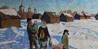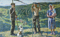 特卡乔夫兄弟(兄,1922年生 弟,1925年生)曾就读于莫斯科苏里科夫美术学院谢·格拉西莫夫工作室。卫国战争的参加者。曾荣获卫国战争奖章和“勇敢”奖章等,俄罗斯人民美术家,苏联艺术科院院士,苏联国家艺术奖金获得者,艺术院创作室领导人。1952年起,两兄弟开始合作,积极参加展览活动,参加了60多次在俄罗斯国内外举办的画展,是当今极有影响的艺术家。作品主要描写农村和农民生活。1950年两兄弟先后毕业于莫斯科国立苏里科夫美术学院油画系。1957年参加全苏《十月革命四十周年》展览,莫斯科。1960年完成《战斗的间隙》,此画与另一副《为了土地、为了自由》在1968年一同获俄罗斯联盟共和国列宾文艺奖。1963年同时当选苏联美术研究院院士。1963年两兄弟同时获俄罗斯联邦功勋美术家称号。1964年赴法国博物馆学习交流。1965年参加全苏《苏维埃俄罗斯》展,莫斯科。1966年以苏联美术家代表团身份访问意大利。1977年在全苏联第五届美代会上当选理事会书记。1977年画作《割草季节·中午》和《六月·在和平的天空下》获1977年度苏联国家奖。1978年同时当选苏联美术科院院士。1983年同时当选为苏联人民美术家称号。1985年哥哥谢尔盖·特卡乔夫当选第十一届俄罗斯联邦最高苏维埃国家副主席。1992年—1995年 两兄弟主要从事对早年创作的研究,以新的角度画了许多原有作品的变体画。