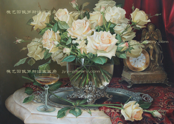 娇艳欲滴的玫瑰配以唇齿留香的美酒,精心雕琢的银制器皿闪耀着华贵的光彩,具有民族特色的绒毯铺在温润的大理石台面上。作品通过画家手中的画笔精心绘制出来,功力深厚,笔法干净,给人以华丽而不失典雅之美的感觉。